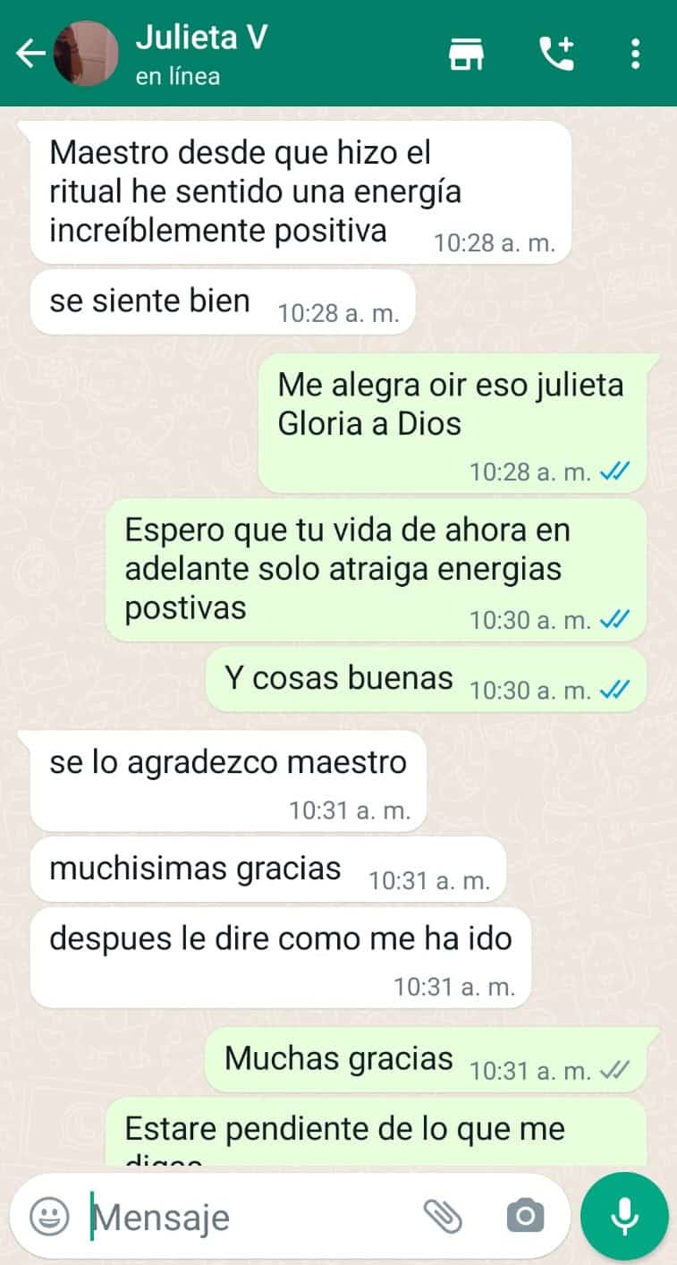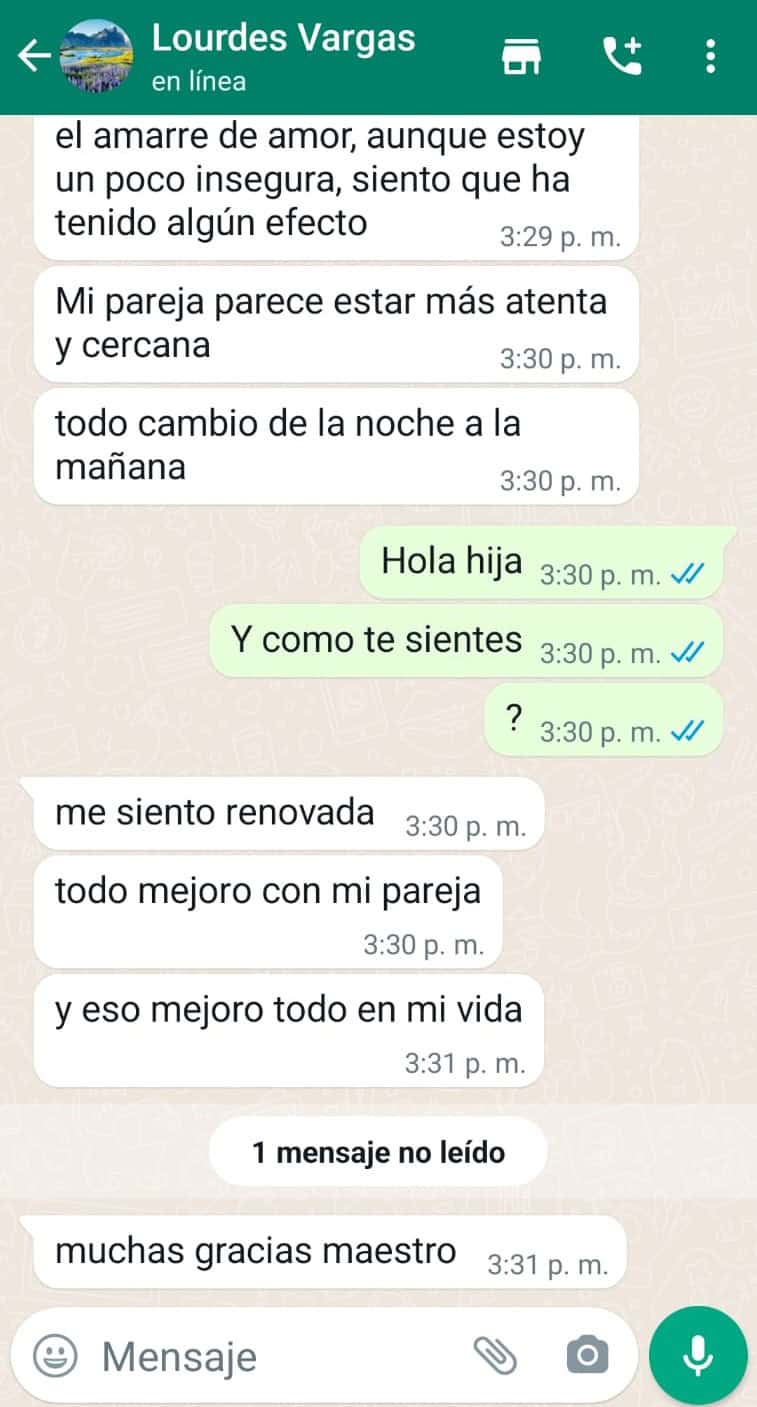 Llevábamos seis meses sin hablar y él ya estaba saliendo con otra persona. Decidí probar el amarre con mucha fe, sin esperar milagros… pero a los 12 días me escribió. Me pidió disculpas, dijo que no podía dejar de pensar en mí. Hoy estamos juntos otra vez, más unidos que antes.